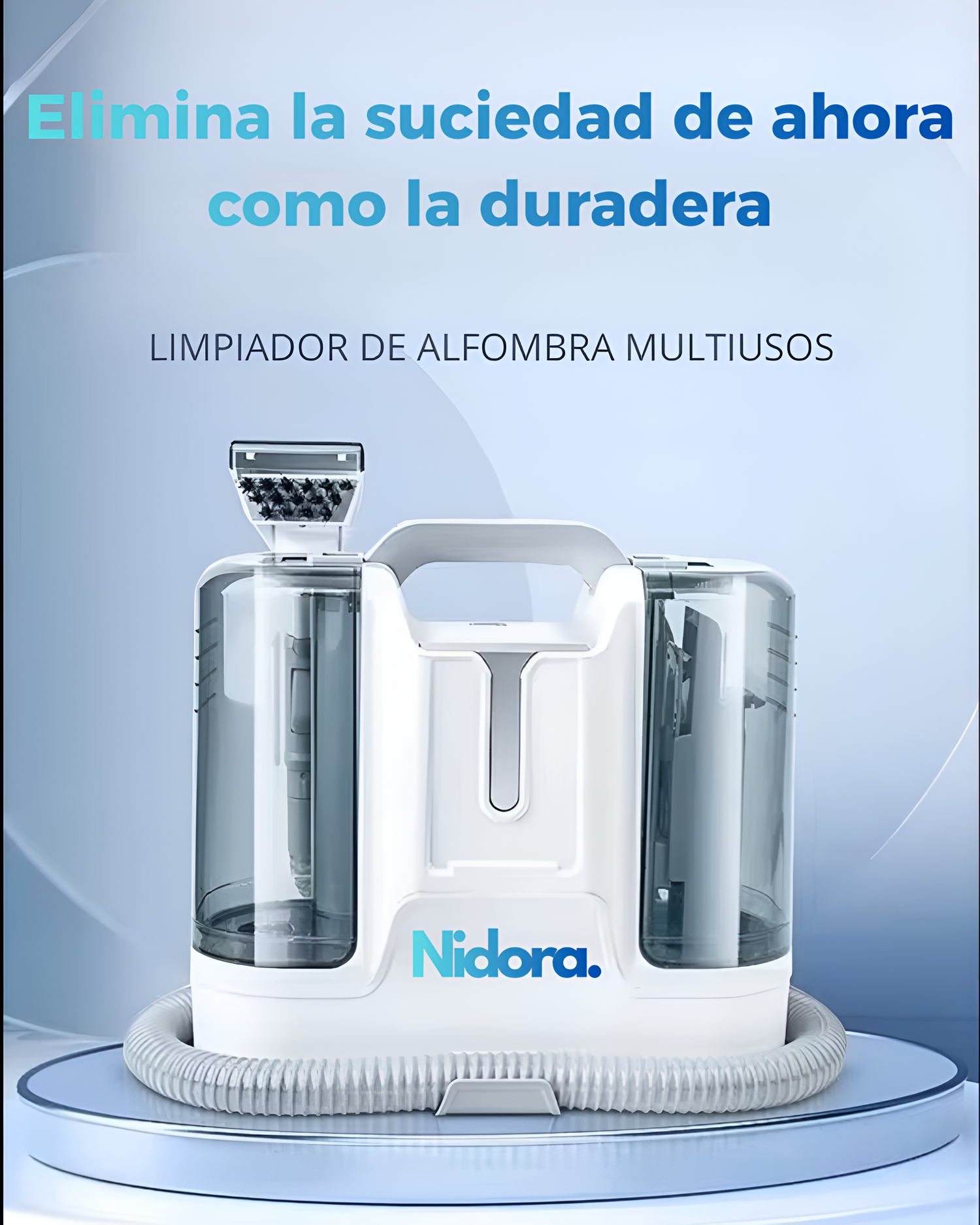 El Limpiador de Alfombras Multiusos Nidora está diseñado para tratar manchas recientes y suciedad acumulada en alfombras, sofás, asientos de coche y más.